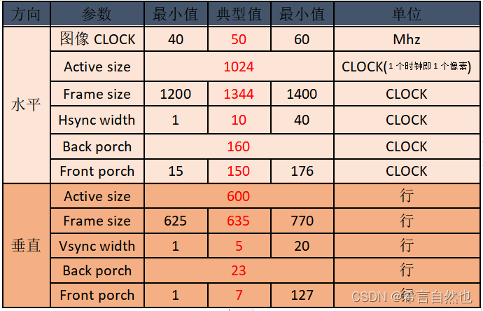 现在假设我们得到了一块屏幕,需要对其进行自定义分辨率设计,我们首先需要根据该屏幕的尺寸大小找到相关参数。例如如下是对1024*600的参数说明: